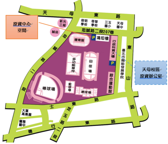 原資中心位於「天母校區」鴻坦樓5樓 B512教室(如下圖所示) 地址於臺北市士林區忠誠路二段101號